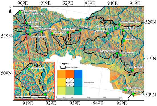 To build the maps, the DAICHI satellite (ALOS) survey with a resolution of 30 m2 was used together with the 3D Analysis module in the ArcGIS environment. To delineate the catchments of the studied rivers, the Flow Direction module was used in the ArcGIS environment, which calculates flow lines based on data on the heights of nearby points.