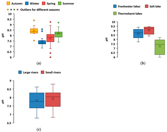 The values of pH varied significantly during different seasons of the year (F = 11.31, p = 0.000, Figure 3a) and between the two major types of the water bodies—lakes and rivers (F = 10.67, p = 0.000; Figure 3b,c). The electrical conductivity (E.C., µS cm−1) in the studied water bodies varied widely and increased in the following order: thermokarst lakes (29 ± 22) < large rivers (172 ± 97) < small rivers (207 ± 121) < freshwater lakes (534 ± 252) < salt lake (54,600 ± 24,380).