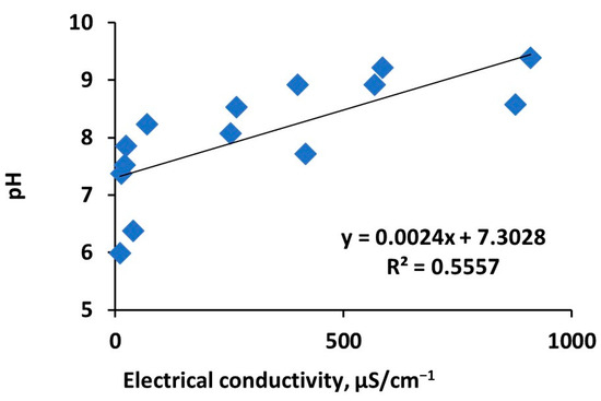 The water bodies of the Alash plateau, both rivers and lakes, exhibited the lowest E.C. In winter and autumn during low-water season, the electrical conductivity was significantly higher than in spring and summer (F = 3.3, p = 0.03), see Supplementary Figures S1 and S2. For lakes, a significant relationship (p < 0.05) between electrical conductivity and the pH was established (Figure 4). No such relationship was revealed for rivers. A strong direct relationship between electrical conductivity and DIC content was also observed (Figure 5), which reflected the dominance of bicarbonate ions in the major salt composition of both rivers and lakes (Supplementary Table S1).