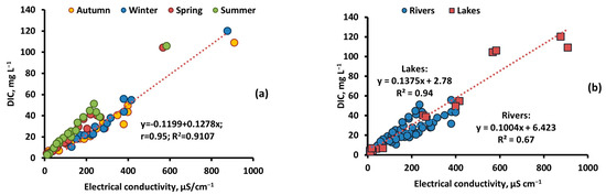 Linear relationship between DIC concentration and electrical conductivity in rivers and lakes of the Tyva region (a) in different seasons (lakes and rivers together) and (b) in different types of objects (averaged across seasons).