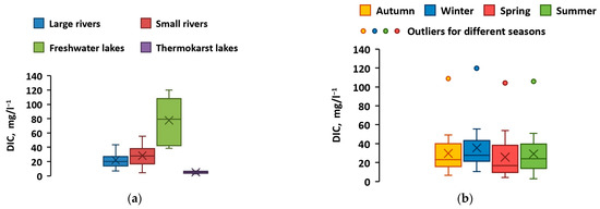 Median (and IQR) boxplots of DIC concentration (mg/L−1) (a) in different types of objects (averaged across seasons) and (b) in different seasons (lakes and rivers together).