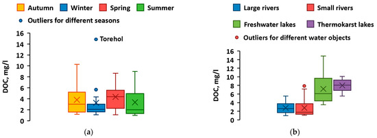 Median (and IQR) boxplots of DOC concentration (mg L−1) in different types of objects (a) in different seasons (lakes and rivers together) and (b) in different types of objects (averaged across seasons).