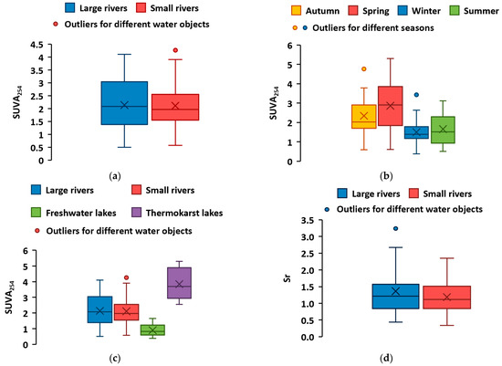 Median (and IQR) boxplots of SUVA254 (a) in large and small rivers (averaged across seasons); (b) in different seasons (lakes and rivers together); (c) in different types of objects (averaged across seasons) and SR; and (d) in large and small rivers (averaged across seasons).