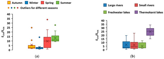 There was no strong variation in the value of SUVA254 in the waters of both small and large rivers (Figure 8a). However, small river waters had a lower SR value, which indicated an increased degree of aromaticity compared to large rivers (Figure 8d). A high index of SUVA254 (3.8 ± 1 L mg−1 m−1) and a low index of SR (0.9 ± 0.1) in the waters of thermokarst lakes indicated the presence of high-molecular-weight aromatic compounds. In contrast, freshwater lakes, poor in DOC, exhibited much lower SUVA254 and higher SR values compared to thermokarst lakes. The ratio of optical densities E254:E436 in rivers followed the order ‘summer > spring > autumn > winter’ (Figure 9a). This ratio was much higher in thermokarst lakes compared to rivers and freshwater lakes (Figure 9b).