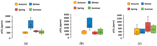 Median (and IQR) boxplots of CO2 partial pressure (ppmv) in (a) large and (b) small rivers across seasons, which are statistically different (large rivers, F = 12.20, p = 0.001; small rivers, F = 7.801, p = 0.001, accordingly). (c) Median (and IQR) boxplots of CO2 partial pressure (ppmv) in lakes across seasons (F = 0.9223, p = 0.46).