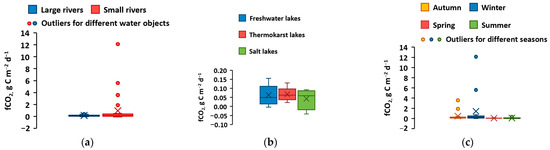 Overall, CO2 emissions from the surface of rivers and lakes were quite low (median 0.05–0.15 g C m−2 d−1; Table 4) and did not differ significantly (p > 0.05) among water bodies, including the two main categories—rivers and lakes (Figure 12a,b). There was no significant difference in fCO2 between different seasons of the year (Figure 12c). Exceptionally high CO2 fluxes in water were encountered in the Chadan River and the Ak-Sug River (12 and 5.6 g C m−2 d−1, respectively). Despite their small size, these rivers do not freeze solid during the ice-on period, and they likely possess sizable bicarbonate/CO2-rich underground sources that are discharged at the river bed and hence are mostly pronounced during the winter baseflow.