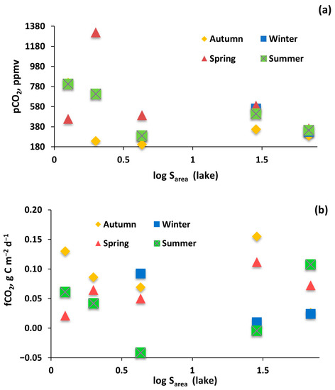 The relationship between (a) pCO2 and (b) fCO2 and lake water surface area of the Tyva region (all seasons together).