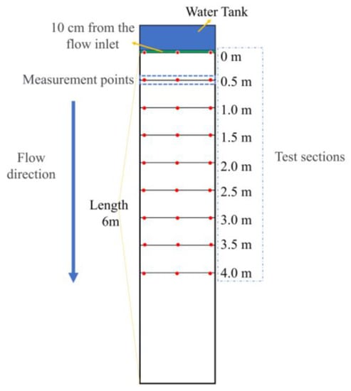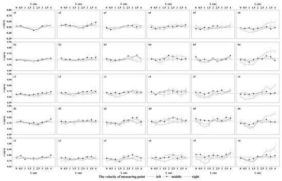 | Flume Width (m) | Discharges per Unit Width (m2/min) | Flow Velocity at Measuring Points | ||
