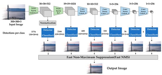 Finally, all the generated default boxes are integrated, analyzed by non-maximum suppression (NMS) and filtered with an intersection over union (IOU) higher than 0.5. The final output contains information about the location, category, and confidence level of the target.