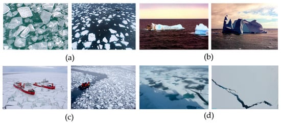 The majority of the images were captured by shipboard cameras and UAVs (Unmanned Aerial Vehicles), and the photographed scenes corresponded to polar ship navigation scenarios. Some of the sample images are shown in Figure 2.