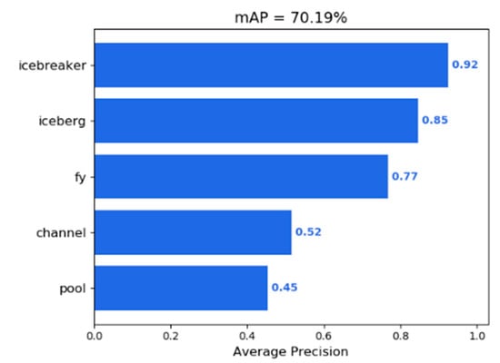 After training, the model was applied to the test set, and finally, an mAP value of 70.19% was obtained. The accuracy of the icebreaker category was the highest at 92%, followed by those of the iceberg category, which was 85%, and of the fy (first-year ice) category, which reached 77%. The accuracies of channel and pool were the lowest, 52% and 45%, respectively, due to the low number of images or labels for these two categories. The detection results for each category are shown in Figure 3. Some of the test results are shown in Figure 4. The SSD model works well for the detection of large targets at close range, but it is not effective in detecting small targets at a distance.