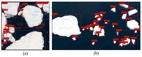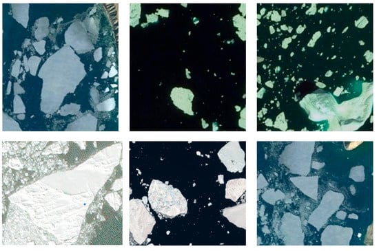 The remote sensing sea ice dataset was mainly derived from the Google Earth (http://earthengine.google.com/, accessed on 25 December 2022) and the Northwestern Polytechnical University (NWPU) datasets [27]. A total of 600 images, obtained after de-duplication, annotation, and review, constituted the dataset. The tag name was ice, and the number of tags was 15,948. It was randomly divided into a training set and a test set at the data ratio of 8:2. Some of the sample images in the dataset are shown in Figure 10.