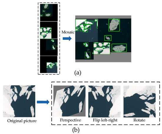 Data augmentation. (a) Mosaic; (b) perspective, flip left–right and rotation processing.