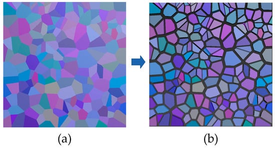 In order to verify the accuracy of the improved YOLOv5 model, we combined simulated sea ice images and real sea ice images into a hybrid dataset. The simulated images were constructed as follows. Firstly, we built a large flat ice field. Secondly, we fragmented the flat ice field to obtain a broken ice field. The Voronoi diagram is morphologically similar to an ice field with large pieces of broken ice and consists of a set of continuous polygons formed by the perpendicular bisectors of lines connecting two neighboring points. We used the RayFire plug-in of 3ds Max to fragment the flat ice field according to the Voronoi diagram, as shown in Figure 13a. Finally, the size of the broken ice field was reduced by 80% to enlarge the gaps between the ice blocks, as shown in Figure 13b.