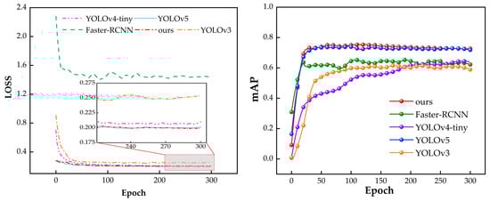 In order to further validate the advantage benefits and efficacy of the improved YOLOv5 model, incorporating the three mentioned modules, a comparative experiment was conducted. We compared the improved model with other conventional models, such as Faster-RCNN, YOLOv3, and YOLOv4-tiny; the values of loss and mAP are shown in Figure 14.
