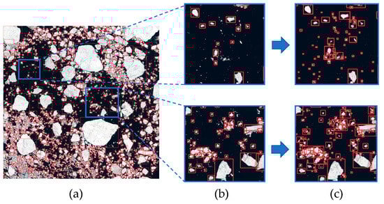 Comparison of the detection results. (a) Detection results for the original YOLOv5; (b) localized zoomed-in views using the original YOLOv5; (c) localized zoomed-in view using the improved YOLOv5.