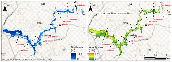 The downstream section of the PL.Dam covered approximately 16.7 kilometres, following the course of the Pampulha River until its confluence with the Onça River, which flows into the Velhas River, marking the municipal boundary of Belo Horizonte (Figure 1). The maximum depths and velocities and the flood wave arrival times are shown in Figure 5 and summarised in Table 2.