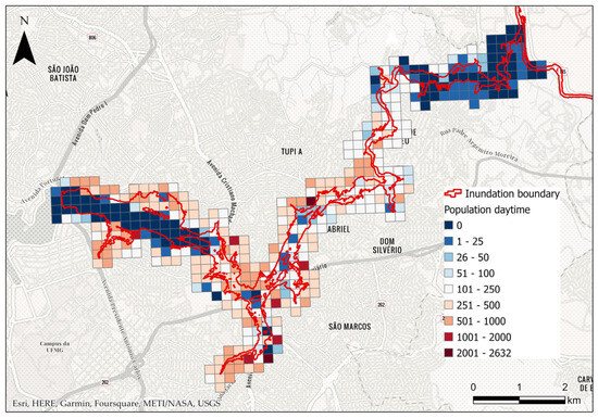 It is crucial to acknowledge that the primary focus of this study, as stated in the dynamic flood simulation section, is not to tackle or elucidate the uncertainties related to the analysis of exposure and vulnerability. Instead, the purpose of conducting exposure and vulnerability analysis is solely to parameterise the SLM in order to facilitate LOL analysis and evaluate uncertainty and efficiency within the context of EWES in various scenarios. The estimated population was aggregated within a statistical grid, a geographic unit derived from Brazilian census data with a spatial resolution of 200 × 200 metres, corresponding to the daytime period used in this study (Figure 6).