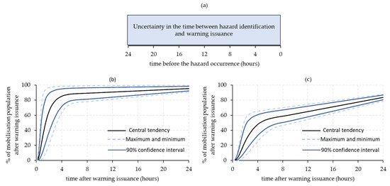 In this work, Monte Carlo simulations were conducted to analyse the warning and evacuation processes in two parts. The first part involved a sufficiently long interval in representing the time between the hazard identification and the warning issuance, ranging from 0 to 24 h, starting at the onset of the rupture and characterised by uniform uncertainty. This interval was used to evaluate the optimal response time for the emergency managers. The second part of the analysis focused on the influence of uncertainty in the recommended values of warning dissemination delay and mobilisation time proposed by Sorensen and Mileti in [64,65]. We examined two types of parameterisation—the first type involved fast warning dissemination and a population with high perception and preparedness for mobilisation. The second type consisted of the same warning dissemination rate, but with a population with low levels of perception and preparedness (Figure 7). Only the mobilisation pattern was varied because this aspect has more impact on time and the evacuated percentage of the population achieved than warning dissemination times.
