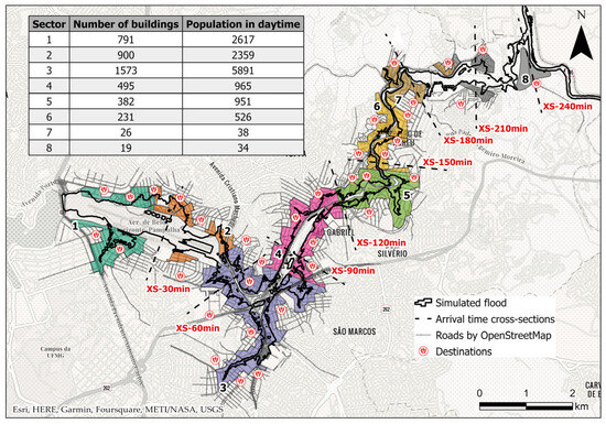Partitioning the downstream valley into distinct sectors and assessing their outcomes using EWES and LOL simulations allows for identifying unique characteristics and proposing specific actions for each sector. In this study, we choose to evaluate sectors based on local conditions and using the distance of approximately 2 kilometres along the flow path of the flood wave to determine the sector’s limits. This discretisation aligns spatially with the arrival time cross-sections, delineated every 30 min. A total of eight sectors were analysed. Among these sectors, the first three exhibited the highest concentration of population and buildings directly impacted by flooding (Figure 8).