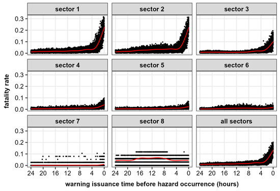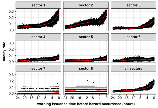 The first three sectors exhibit the highest sensitivity in terms of fatality rates. In cases of high mobilisation, there is an observed trend towards optimising the desired scenario of issuing warnings four hours before the occurrence of the hazard (Figure 9). However, in cases of low mobilisation, such a favourable scenario is not observed, as the likelihood of LOL rates exceeding 0.1 remains prevalent even when alerts are issued up to 12 h before the dam-breach event, specifically for sectors 1 and 2 (Figure 10).