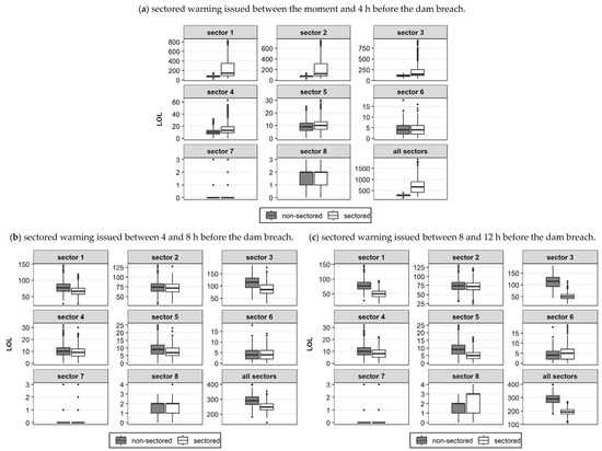 The first four hours (Figure 13a) reveal a notable sensitivity in estimating the LOL, particularly within the first three sectors. However, this sensitivity diminishes between four and eight hours (Figure 13b), with a minor difference of two fatalities simulated in the second sector. A slight decrease in the mean values of LOL from eight to twelve hours is also evident (Figure 13c), except for in the third sector, where the mean value experiences a reduction of over 40%.