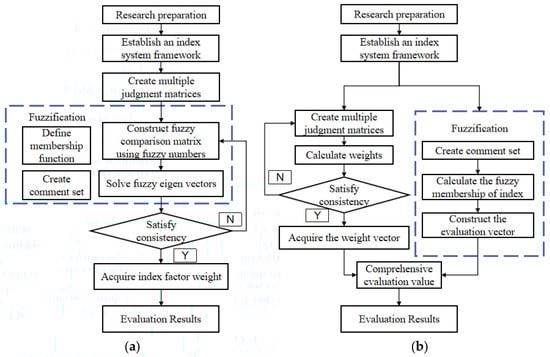 In this study, the index system contains numerous elements necessitating qualitative evaluation, making the AHP a fitting choice. Moreover, owing to the presence of several qualitative indicators, quantifying the evaluation results becomes a challenging task. To address this challenge, we have introduced the principles of fuzzy mathematics into our evaluation framework. It is noteworthy that the integration of AHP and fuzzy mathematics typically can be divided into two types: one is Fuzzy Analytic Hierarchy Process (FAHP) and the other is AHP–Fuzzy Comprehensive Evaluation (FCE), which are depicted in Figure 1. FAHP involves fuzzifying the assigned weights, while Fuzzy Comprehensive Evaluation pertains to the fuzzification of the evaluation results. Due to the authoritative experts in this field who were consulted to assign the weights in this study, fuzzy mathematics was only used for the evaluation results. As such, this study leans towards an AHP-FCE approach (Figure 1b) to establish a set of evaluation index systems for assessing the operation efficiency of an urban combined sewer system.