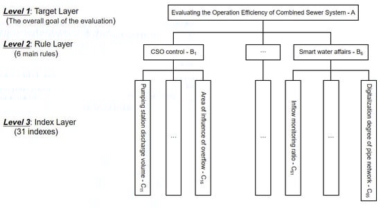 The first level is the Target Layer; its target is to evaluate the operation efficiency of the combined sewer system, which is coded as A.
