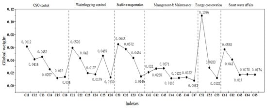 Note that there are 12 indexes with a total weight ratio of more than 0.04, including Total energy consumption (C51), Variation coefficient of inflow volume (C31), Pumping station discharge volume (C11), Ponding depth (C21), Storage capacity (C32), Inflow monitoring ratio (C61), Overloaded pipeline ratio (C25), Wastewater treatment plant overflow ratio (C13), Pumping station dispatch capability (C33), Ponding frequency (C22), Pumping station discharge frequency (C12), and Layout of pipeline monitoring points (C62); the sum of the weights of these indexes is 0.6697, which is an important index affecting the operation efficiency of the combined sewer system.
