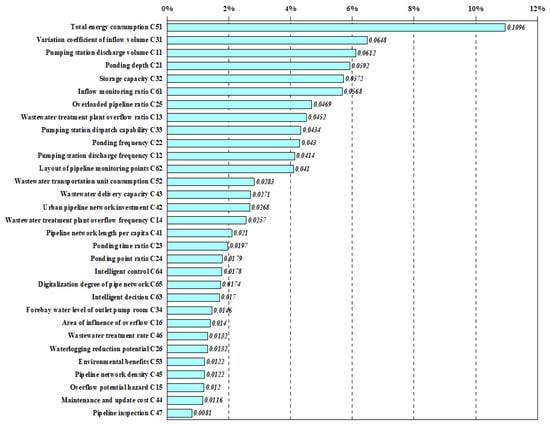 According to Figure 7 and Figure 8, the ranking of the relative importance of the index layer relative to the target layer is Total energy consumption (C51) > Variation coefficient of inflow volume (C31) > Pumping station discharge volume (C11) > Ponding depth (C21) > Storage capacity (C32) > Inflow monitoring ratio (C61) > Overloaded pipeline ratio (C25) > Wastewater treatment plant overflow ratio (C13) > Pumping station dispatch capability (C33) > Ponding frequency (C22) > Pumping station discharge frequency (C12) > Layout of pipeline monitoring points (C62) > Wastewater transportation unit consumption (C52) > Wastewater delivery capacity (C43) > Urban pipeline network investment (C42) > Wastewater treatment plant overflow frequency (C14) > Pipeline network length per capita (C41) > Ponding time ratio (C23) > Ponding point ratio (C24) > Intelligent control (C64) > Digitalization degree of pipe network (C65) > Intelligent decision (C63) > Forebay water level of outlet pump room (C34) > Area of influence of overflow (C16) > Wastewater treatment rate (C46) > Waterlogging reduction potential (C26) > Pipeline network density (C45) > Environmental benefits (C53) > Overflow potential hazard (C15) > Maintenance and update cost (C44) > Pipeline inspection (C47).