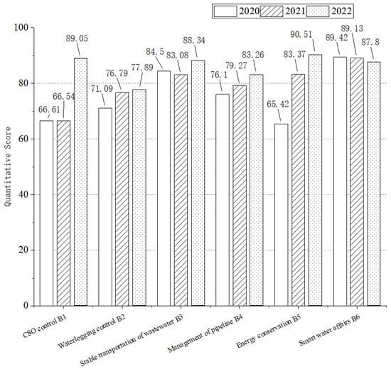 It can be seen from Table 17 that in 2020, the CSO control (B1) of the combined sewer system in the combined sewer area of Shanghai can be judged as C, the Waterlogging control (B2) can be judged as B, the Stable transportation of wastewater (B3) can be judged as A−, the Management and maintenance of pipeline (B4) can be judged as A−, the Energy saving (B5) can be judged as C, and the Smart water level (B6) can be judged as A. In 2021, the CSO control (B1) of the combined sewer system in the combined sewer area of Shanghai can be judged as C, the Waterlogging control (B2) can be judged as A−, the Stable transportation of wastewater (B3) can be judged as A−, the Management and maintenance of pipeline (B4) can be judged as A−, the Energy saving (B5) can be judged as A−, and the Smart water level (B6) can be judged as A. In 2021, the CSO control (B1) of the combined sewer system in the combined sewer area of Shanghai can be judged as A, the Waterlogging control (B2) can be judged as A−, the Stable transportation of wastewater (B3) can be judged as A, the Management and maintenance of pipeline (B4) can be judged as A−, the Energy saving (B5) can be judged as A, and the Smart water level (B6) can be judged as A.