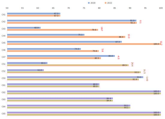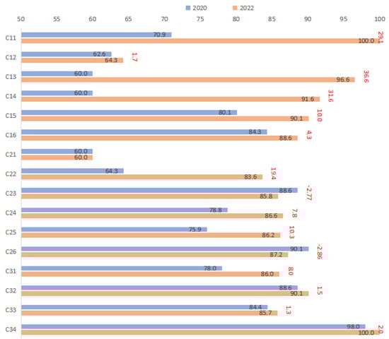 Figure 10 and Figure 11 depict statistical maps illustrating changes in quantitative scores for the index layer between 2020 and 2022. Notably, several indicators, including Pumping station discharge volume (C11), Wastewater treatment plant overflow ratio (C13), Wastewater treatment plant overflow frequency (C14), Ponding frequency (C22), Overloaded pipeline ratio (C25), Wastewater delivery capacity (C43), Maintenance and update cost (C44), Pipeline network density (C45), Total energy consumption (C51), and Wastewater transportation unit consumption (C52), exhibit significant score improvements during this period.