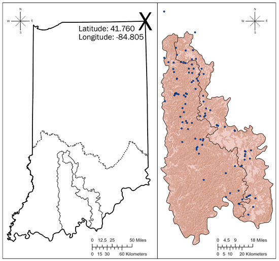 - Gray, H.H. Physiographic Divisions of Indiana; Indiana Geological and Water Survey, Special Report 61; Indiana Geological Survey: Bloomington, IN, USA, 2000; p. 15. [Google Scholar]