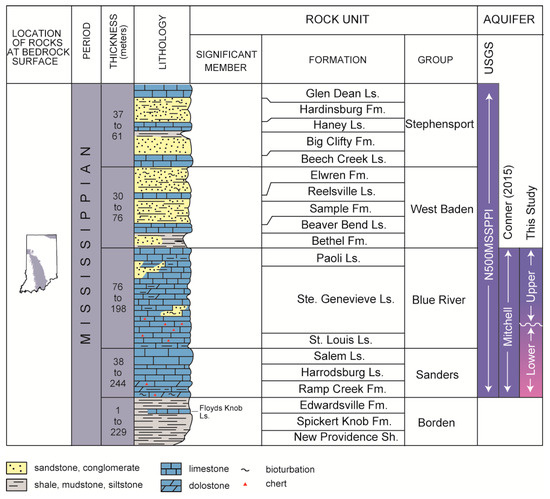 Stratigraphic column showing Mississippian stratigraphic units in Southern Indiana and principal bedrock aquifer systems after [29]. Aquifer designations are identified in the left column and include the USGS principal bedrock aquifer system [30], the Mitchell Aquifer [31], and the subdivisions of the Mitchell Aquifer as presented in this study.