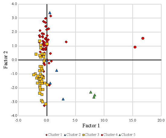 Inventory data, field measurements, and geochemical results are available on a public-facing web service [42]. Charge balances for individual samples are available on this web service—maximum errors were 23.4% and −12.5% with an average of 4.6% and 96 samples having <10% error. Multifactor cluster analysis using the XLSTAT macro in Microsoft Excel and principal component analysis (PCA) using XLSTAT revealed five independent groupings of data for a subset of all parameters, Clusters 1–5, differentiated according to the first two eigenvalues, Factor 1 and Factor 2 (Table 2, Figure 3). Factor 1 incorporates significant positive loadings of SpC, [SO42−], [F−], [Cl−], [Ca2+], [Mg2+], [K+], [Na+], and [Sr2+], and negative loadings of DO and computed Eh. Factor 2 incorporates loadings of T and alkalinity.