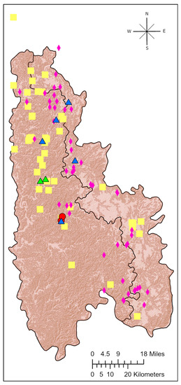 Clusters 4 (two springs) and 5 (three springs), are distinctly different from Clusters 1 and 3 and are the mineral-rich springs of the inventory in the Crawford Uplands. They all share enriched [SO42−] on the Piper and Durov diagrams (Figure 5 and Figure 6), aligning well with earlier study [21]. These two clusters have strong PCA loading on factor 1; however, they have opposing PCA loading on factor 2 (Figure 3). Cluster 4 consists of the mineral springs at French Lick. They are alkaline earth waters with excess alkalines having a high SpC (>4500 μS/cm) and pH values below 7. Cluster 5 consists of mineral springs north of French Lick along the White River. They are alkaline earth waters with SpC clustered at 2600 μS/cm and pH values between 7.1 and 7.4. Cluster 2, comprising five springs in both the Mitchell Plateau and the Crawford Uplands, are alkaline earth waters with excess alkalines (Figure 5) and combine the characteristics of both fresh and mineral springs with somewhat-elevated SpC (Figure 6).