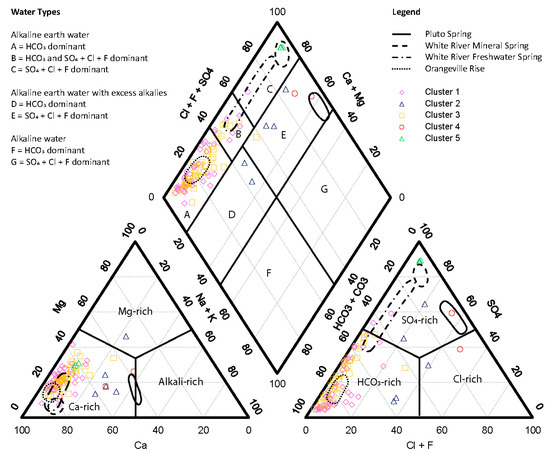 Piper diagram of spring data divided into clusters with previously identified areas of data shown in [21]. The axes of the ternary diagrams are the proportional percentage of each component to the cations (lower left) and anions (lower right) in solution. Piper plot constructed using the USGS groundwater software package, Version 1.30 [43] with fields modified from [44].