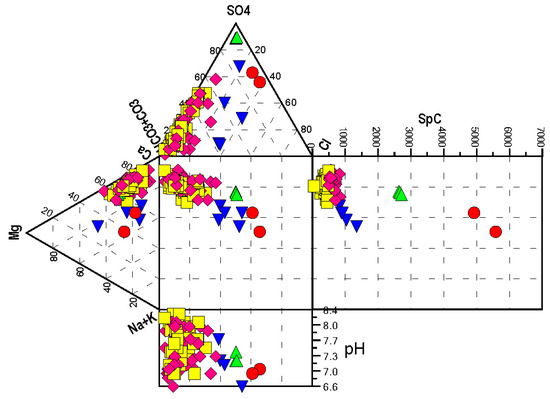 Durov diagram of spring data divided into clusters. Cluster 1 springs are magenta diamonds. Cluster 2 springs are blue triangles. Cluster 3 springs are yellow squares. Cluster 4 springs are red circles. Cluster 5 springs are green triangles. The axes of the ternary diagrams are the proportional percentage of each component to the cations (left) and anions (top) in solution. The field-measured pH of the spring water is shown at the bottom. The field-measured specific conductance (SpC) of the spring water is shown at (right) in mS/cm.
