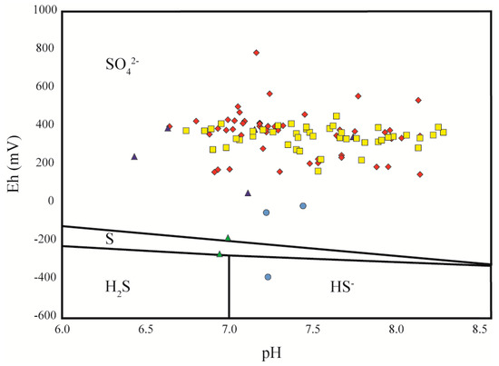 Regional evidence of this influence was already established in the Cumberland Plateau of Southern Kentucky [61]. In Cluster 4, the mineral springs at French Lick, significant sulfide is present and the oxidation of this sulfide contributes to high [SO42−] and to lower pH. Elemental sulfur was precipitating at one of the two sampled springs (New Sprudel), an observation matching the Eh-pH diagram (Figure 7). SpC values in these samples are very elevated because of high concentrations of total dissolved solids, including significant contributions of Na+ and Cl− (Figure 5).