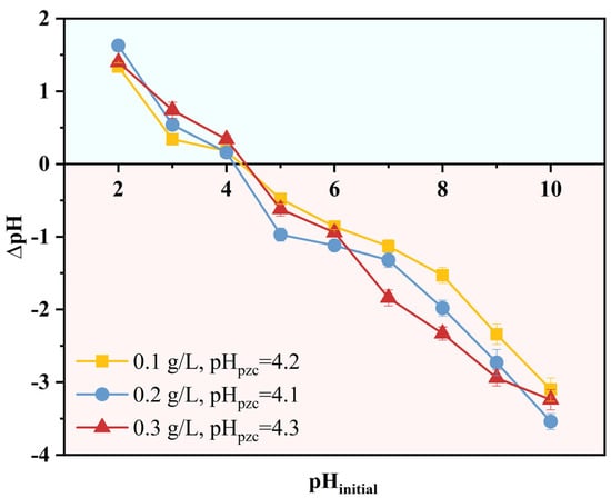 The point of zero-charge (pHPZC) of MOPs was calculated using the pH drift technique []. Firstly, the pH of the solutions was set via the addition of either HCl or NaOH (0.1 mol/L) to a range between 2 and 10. The MOPs were thereafter introduced into each solution and securely sealed using parafilm. The suspensions were then subjected to agitation at a speed of 150 rpm for a duration of one day. The pH measurement was conducted after a 24-hour period of pH stabilization. The points of equality between initial pH and final pH were found by analyzing the graphs depicting the change in pH (ΔpH) as a function of starting pH. The determination of the point of zero charge (pHpzc) was performed.