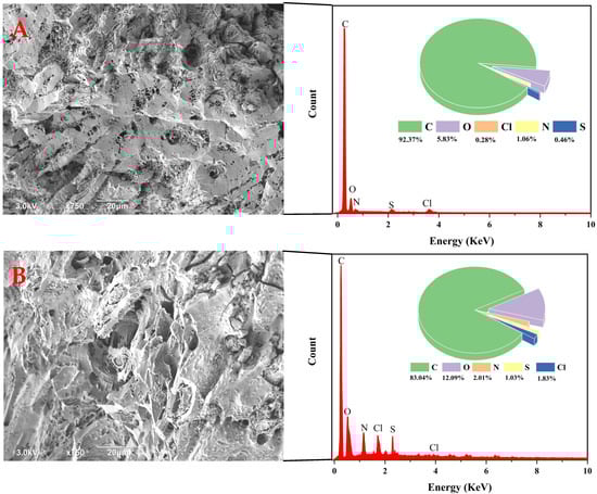 After being treated with an H2SO4/HNO3 mixture, samples of MOPs and LMOPs were analyzed by scanning electron microscopy (SEM) for potential morphological alterations. Figure 2 illustrates the SEM-EDS for MOPs (a) and LMOPs (b). The figure’s micrographs reveal that the structural integrity of the samples has not been compromised in any way. The limited level of functional group change on the graphitic structure of biochar under moderate acidic treatment conditions might explain the lack of apparent morphological modifications. After 15 h of treatment with HNO3 vapor at 200 °C, Xia and colleagues found no morphological alterations in carbon nanotubes []. When laccase was immobilized on biochar to remove toxic malachite green from water, Pandey and co-workers noticed no significant changes in the surface topography, as evidenced by scanning micrographs []. In addition, Rosca and co-workers stated that no visual alterations occurred after oxidizing multiwall carbon nanotubes (MWCNTs) in concentrated HNO3 for 6 to 9 h. After one day of oxidation, however, fewer nanotubes were observed to have been destroyed []. The potential cause of this phenomenon could be attributed to the relatively small dimensions of the laccase protein, ranging from 60 to 90 kilodaltons (KDa), which corresponds to a particle size below five nanometers []. Micrographs with a magnification of one micrometer have difficulty capturing this scale. However, EDS results revealed an increase in element N due to the addition of laccase.