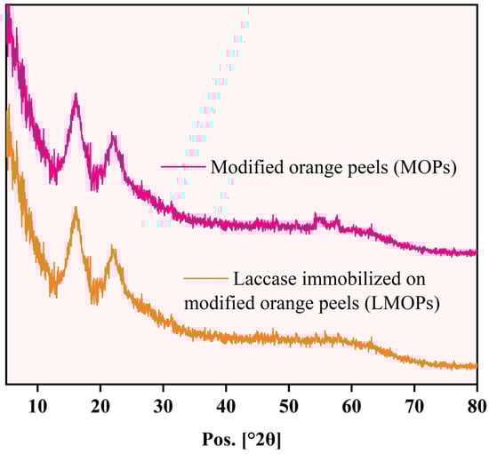 X-ray powder diffraction (XRD) spectrum of modified orange peels (MOPs) and laccase immobilized on modified orange peels (LMOPs).
