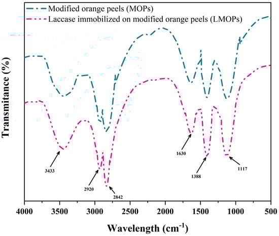Figure 4 demonstrates the FTIR for MOPs and LMOPs. The infrared spectra exhibit a wide peak at 3433 cm−1, which corresponds to the elongation vibration of the O–H bond in MOPs, as reported by Belala et al. (2011) []. The vibrational mode detected at a wavelength of 2920 cm−1 is associated with the asymmetric and symmetric stretching of the C–H bonds within cellulose [,]. The presence of a peak at around 1630 cm−1 suggests the occurrence of a stretching vibration related to the C=O bond in the carboxylic acid functional groups of xylan, which is a constituent of hemicelluloses [], which is also suggestive of the amide bond in the laccase protein, confirming its immobilization on the surface of MOPs []. The band detected at a wavenumber of 1260 cm−1 corresponds to the vibrational mode associated with the C–O methoxy groups present in lignin. The laccase addition had a very subtle effect on LMOPs, as indicated by the minor increase and expansion of the 1117 cm−1 peak.