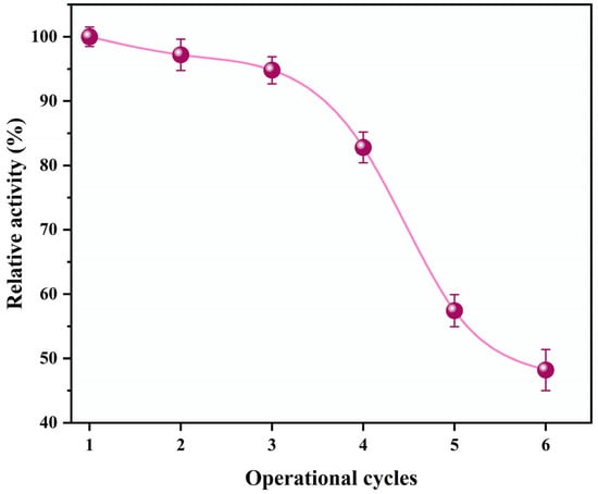 As shown in Figure 5, the residual activity of LMOPs after six regeneration cycles was 48.2% of its initial activity. Even though the relative activity of LMOPs progressively decreased as the number of recycles increased, it stayed higher than 50% after the fifth cycle. The decline in activity seen could be attributed to the disruption of the laccase structure, resulting in its inactivation, as well as the release or detachment of the laccase after repeated washing. Imam and colleagues (2021) used acid-treated rice straw biochar to immobilize laccase and discovered 60% residual activity following six cycles []. The reduction in laccase activity was attributed to leaching from the adsorbent throughout rinsing and/or denaturation. Utilizing an orthogonal experimental design, Zheng and co-workers [] conducted research on the process of immobilizing laccase onto magnetically modified wheat straw biochar by the use of a cross-linking agent (glutaraldehyde) and observed a 22% decrease in activity after five ABTS oxidation cycles.