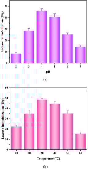 Immobilization of laccase involves binding the enzyme to a solid support by covalent bonding, entrapment/encapsulation, cross-linking, as well as adsorption. The most common and straightforward technique for immobilizing laccase is adsorption. In recent years, many materials like bentonite, activated carbon, biochar, metal-organic frameworks (MOFs), and chitosan have been identified as possible carrier materials []. Biochar has attracted significant attention because of its large specific surface area, porosity, affordability, and widespread accessibility. In addition, biochar can be modified with alkaline and acidic solutions to improve its efficacy. Activated carbon derived from agricultural wastes is a carbon material with beneficial features, including a high specific surface area, high-load enzyme immobilization, excellent dispersibility, and biocompatibility for stable operation [].