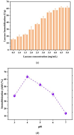 The impact of pH (a) and temperature ranges (b), and the laccase concentrations (c) as well as the immobilization yield (d) on the system.