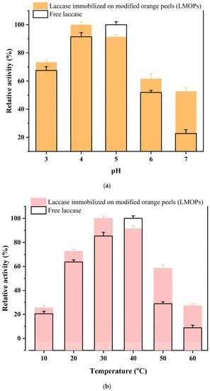 Stability of free laccase and laccase immobilized on modified orange peels (LMOPs) with respect to pH (a) and temperature (b).