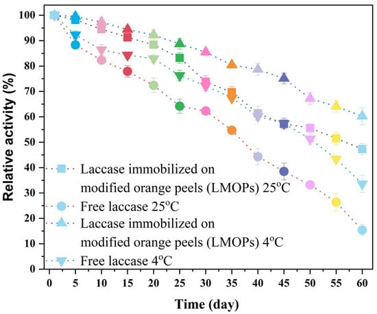 Stability of free laccase and laccase immobilized on modified orange peels (LMOPs) at 4 °C and 25 °C.