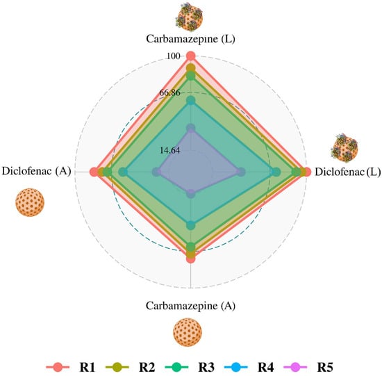 LMOPs and MOPs samples were tested in batch mode for up to five cycles, and the results are depicted in Figure 9. For both carbamazepine and diclofenac, the contribution of adsorptive (MOPs) and immobilized-laccase removal (LMOPs) over the course of time was examined. With the LMOPs sample, near-complete elimination occurred over time. It is predicted that a succession of continuous adsorption of both contaminants by MOPs onto vacant sites (sites available after laccase immobilization) could be anticipated. Therefore, the first cycle of adsorption experiments with MOPs revealed removal efficiencies of 73.34% and 82.51% for carbamazepine and diclofenac, respectively. The key factors contributing to the insufficient breakdown of micropollutants are the low oxidative efficiency of laccase and the steric barrier between laccase and the target molecule []. Possibly enhanced electron transfer between laccase and contaminants after adsorption on the MOPs surface contributes to the simultaneous and complete removal of both contaminants.