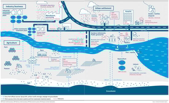 Schematic overview of possible entry pathways of micropollutants into waters, published in []. Reprinted with permission from German Environment Agency, 2023, Jörg Rechenberg.